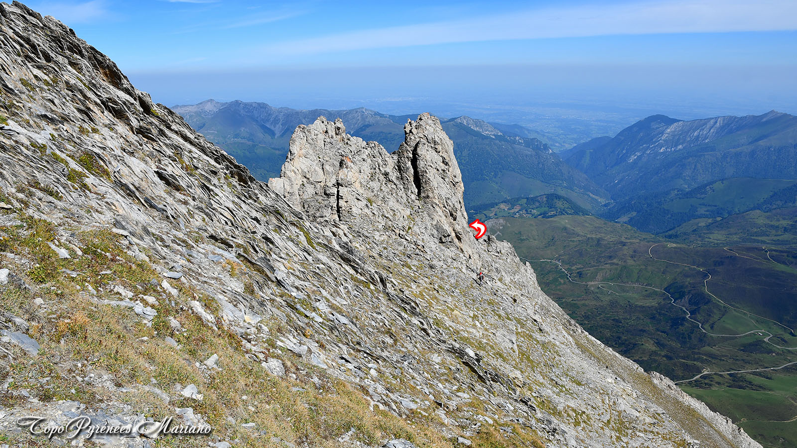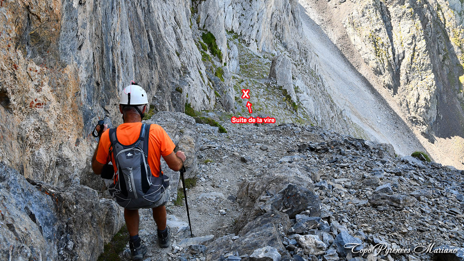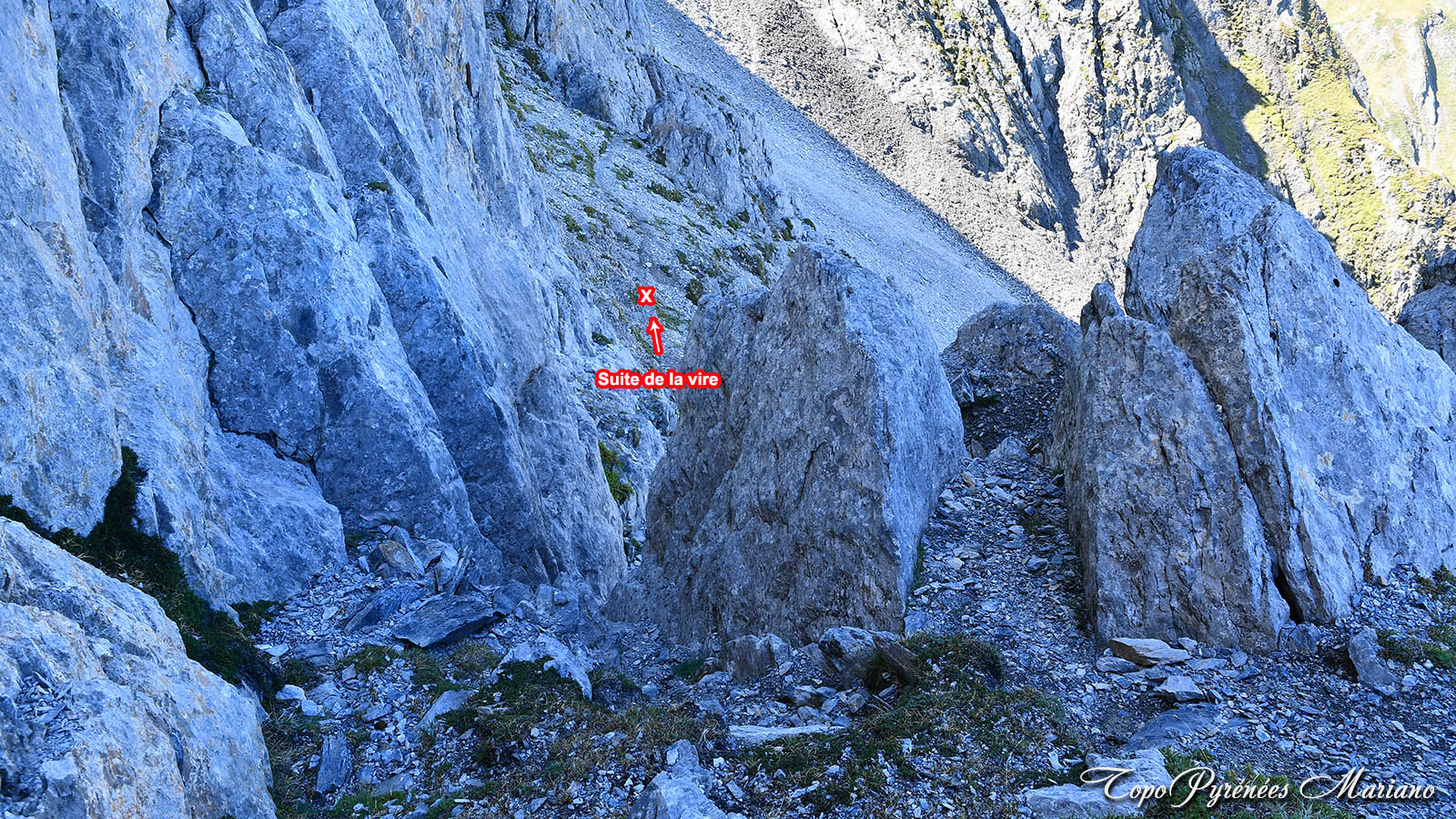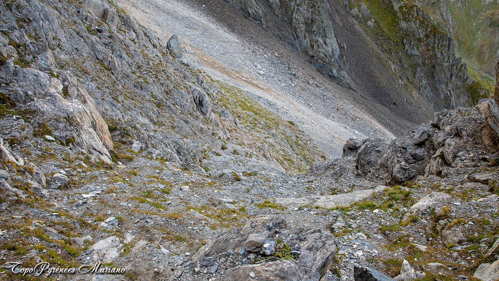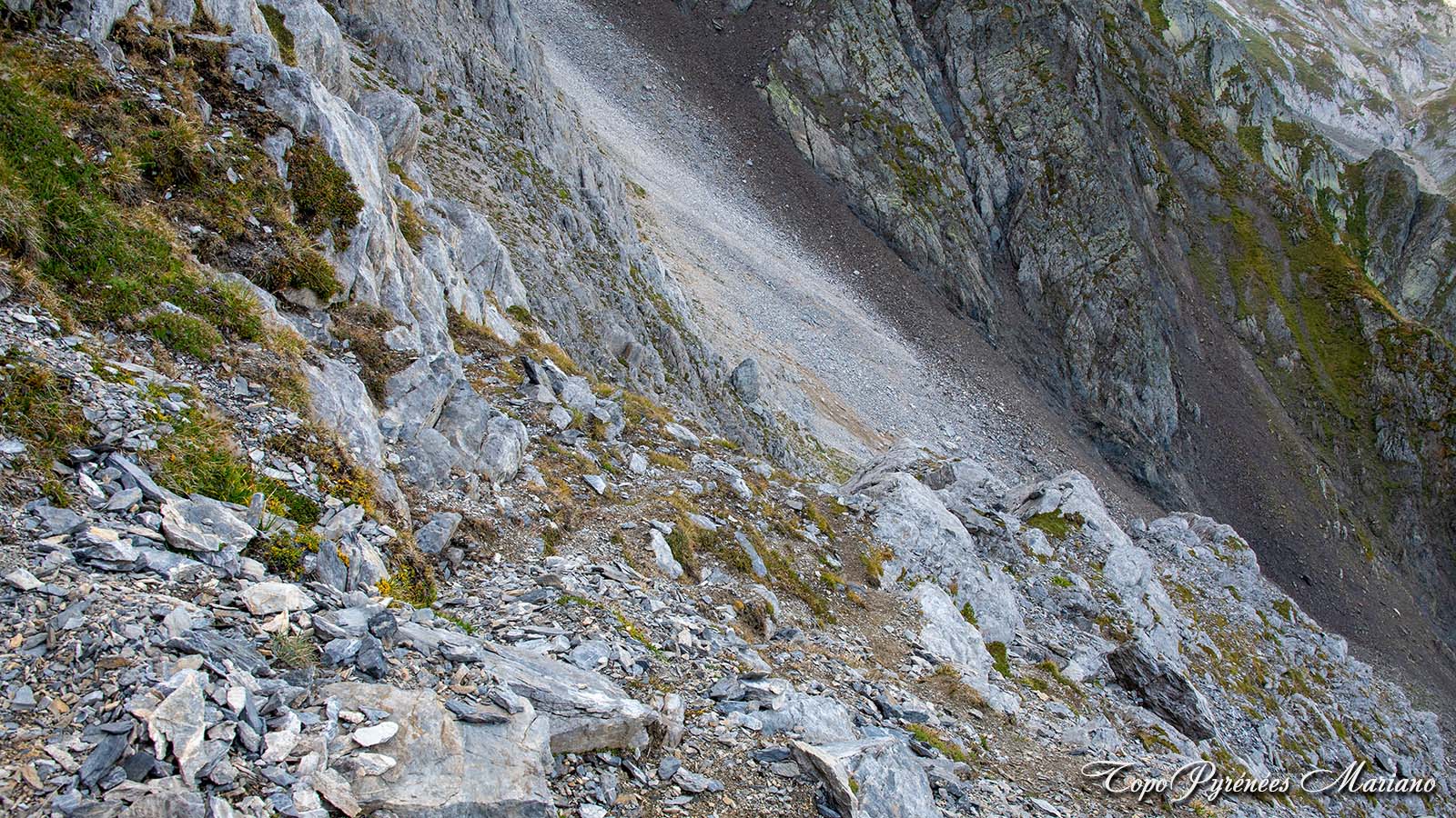 - Attention pour le retour: 80m après avoir descendu le début de la vire depuis la brèche Édouard vers 2450m, quitter la vire en prenant à droite (Sud-Ouest) pour revenir par le même itinéraire qu’à la montée. Ne pas suivre la vire sur un sentier bien marqué qui vous incite à continuer en descendant le long de la paroi rocheuse du petit Gabizos jusqu’à une cheminée étroite et encaissée sur un terrain vraiment instable (gravillons) soyez très prudent si vous descendez par cette cheminée. Nous concernons, nous avons poursuivi à gauche de cette cheminée en espérant éviter la barre rocheuse, mais le terrain est encore plus pourri, instable et très pentu, revenir en arrière c’est plus prudent, voir les photos qui parlent elles-mêmes !