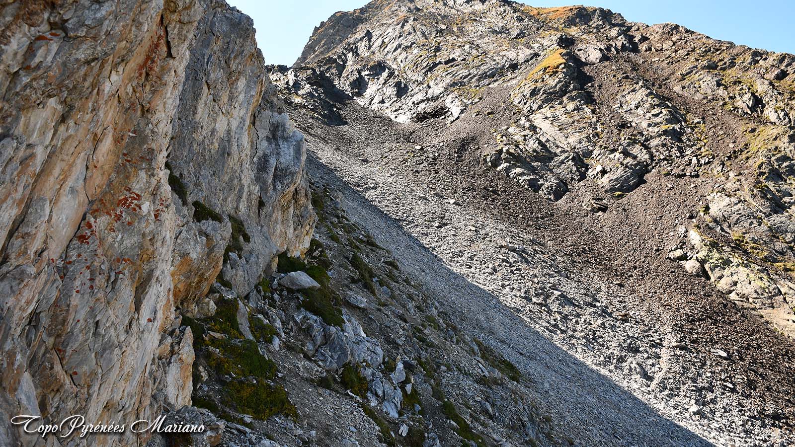 - La suite après la brèche Édouard, consiste à remonter à flanc des dalles fissurées sur du bon rocher (Niv: II+) voir un passage de niveau III au niveau de la grosse fissure.