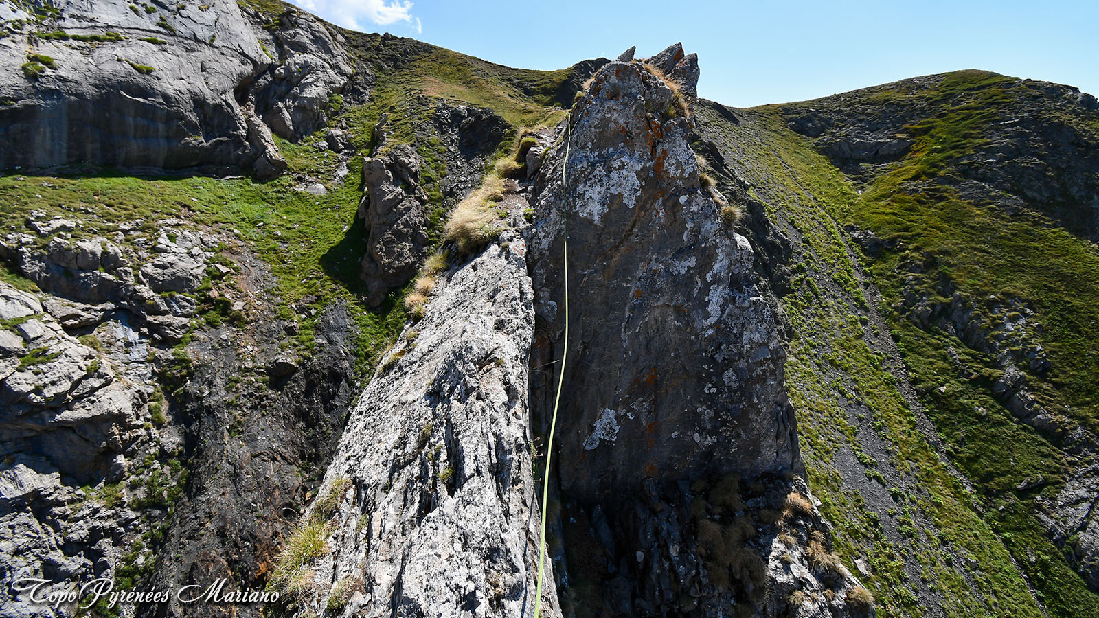 La L5 se termine par un parcours de crête aérien dangereux malgré sa cotation de II, surtout après les difficultés passées et le traditionnel relâchement habituel que nous avons tous, restez très vigilants même si ça reste facile, un seul relais au milieu !