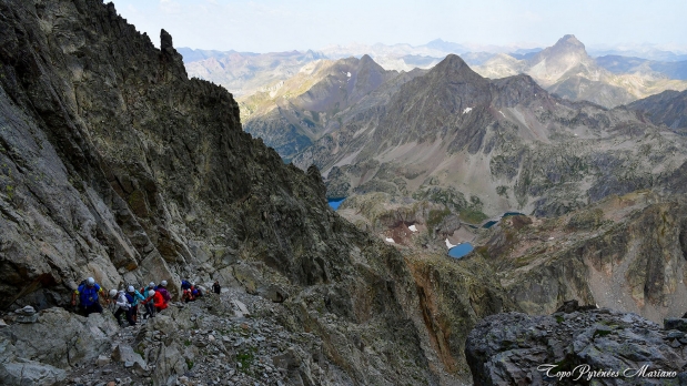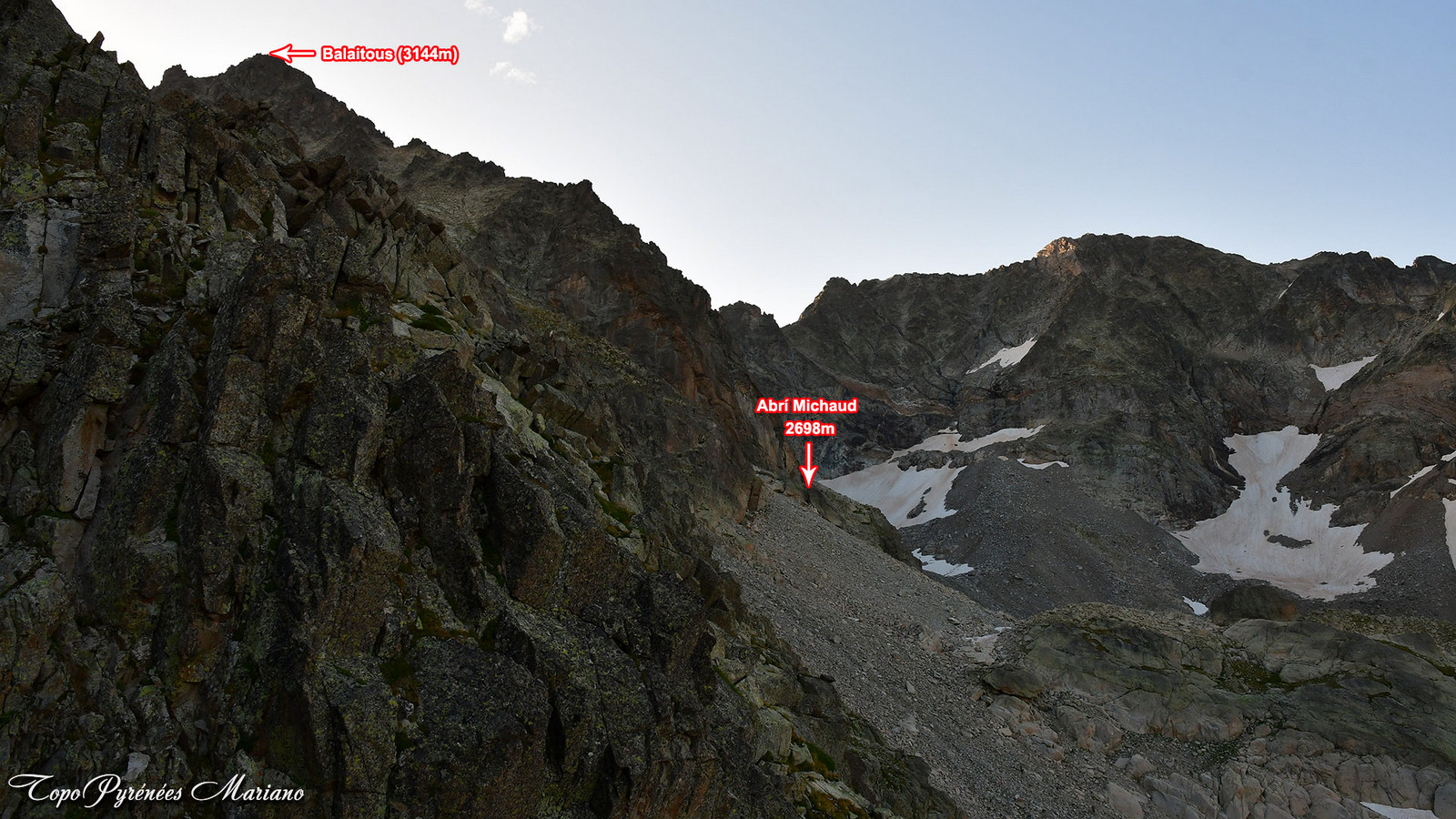 Le pic du Balaïtous avec ses 3.144m d’altitude est le premier sommet de la chaîne dépassant les 3.000 m depuis l’Océan. Il est le plus haut sommet du massif du Balaïtous, massif granitique pyrénéen se situant à la frontière entre la France et l’Espagne. Son itinéraire est long et un peu complexe après les lacs de Batcrabère. Il faut franchir dans un premier temps la brèche des Ciseaux en laissant à gauche le col Noir qui est délaissé depuis plusieurs années à cause de sa pente dans les éboulis très abrupte (1 pas devant pour 2 derrière). La suite consiste à rejoindre l’abri Michaud qui est au pied de la Grande Diagonale, une nervure taillée dans la falaise presque verticale dominant des à-pics vertigineux et spectaculaires qu’il faut remonter presque jusqu’à la brèche des Isards sans l’atteindre. Cette Grande Diagonale est plus spectaculaire que difficile en l’absence de neige. L’ascension se termine en utilisant les mains jusqu’au sommet (Niv: II+).