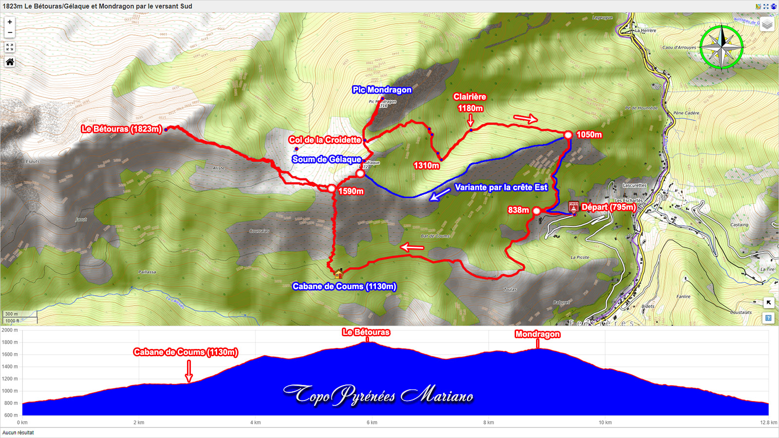 Une magnifique boucle à faire dans un secteur peu fréquenté pour gravir les trois sommets que sont les Bétouras, Gélaque et Mondragon. La montée par le versant Sud depuis la cabane de Coums (1130m) est épuisante à cause de la végétation au sol et surtout de la pente qui avoisine les 45° (+460m de dénivelé en seulement 1,6km). Une variante existe pour éviter cette dure montée, prendre l’itinéraire de retour jusqu’à la crête (1050m), puis suivre le fil de crête Est jusqu’au pied du soum de Gélaque vers 1640m et reprendre l’itinéraire de ce topo, voir les données ci-dessous: