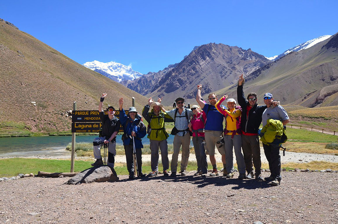 Photo du groupe au départ de Horcones (2 950m) : de G a D – Jordan – Daniel – Richard – Scot – Katy – Steve – Audrey – Guide Federico et Stevie.