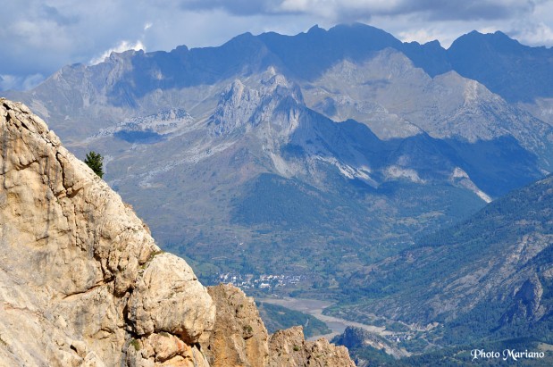 La pic de Soques 2716m avec la Foratata 2341m au milieu et le village de Sallent de Gallego 1300m.