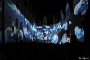 - La nuit, dans la cour, une voix de femme s’élève qui demande délivrance, les fenêtres s’éclairent une à une. Un enfant va naitre dans une carapace de tortue et qui aura un grand destin. Ces fenêtres virtuelles ouvertes sur la cour sont autant de scènes qui déroulent le fil de l’Histoire. Toutes les fenêtres sont animées pour évoquer la naissance d’Henri le Grand, son règne et sa place unique dans le coeur des Français. Elles font revivre un souverain mythique toujours présent, cette figure centrale, auréolée par une vie restée exceptionnelle dans nos mémoires. Toutes les fenêtres déclinent la même histoire dans le temps. C’est l’intérieur du Château, c’est la nuit qui vit à travers ces tableaux vivants Plutôt qu’une reconstitution historique, La lune avec les dents se veut une métaphore poétique et esthétique où chacun pourra trouver un moment d’émerveillement et de rêve.