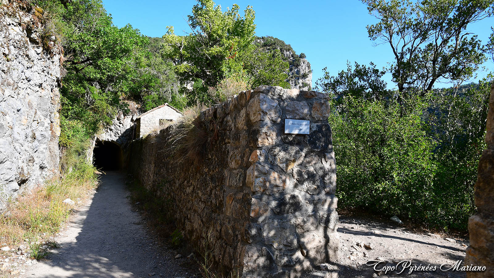 L’arrivée à la cabane du garde-canal avec une plateforme à droite pour un point de vue sur les Gorges.