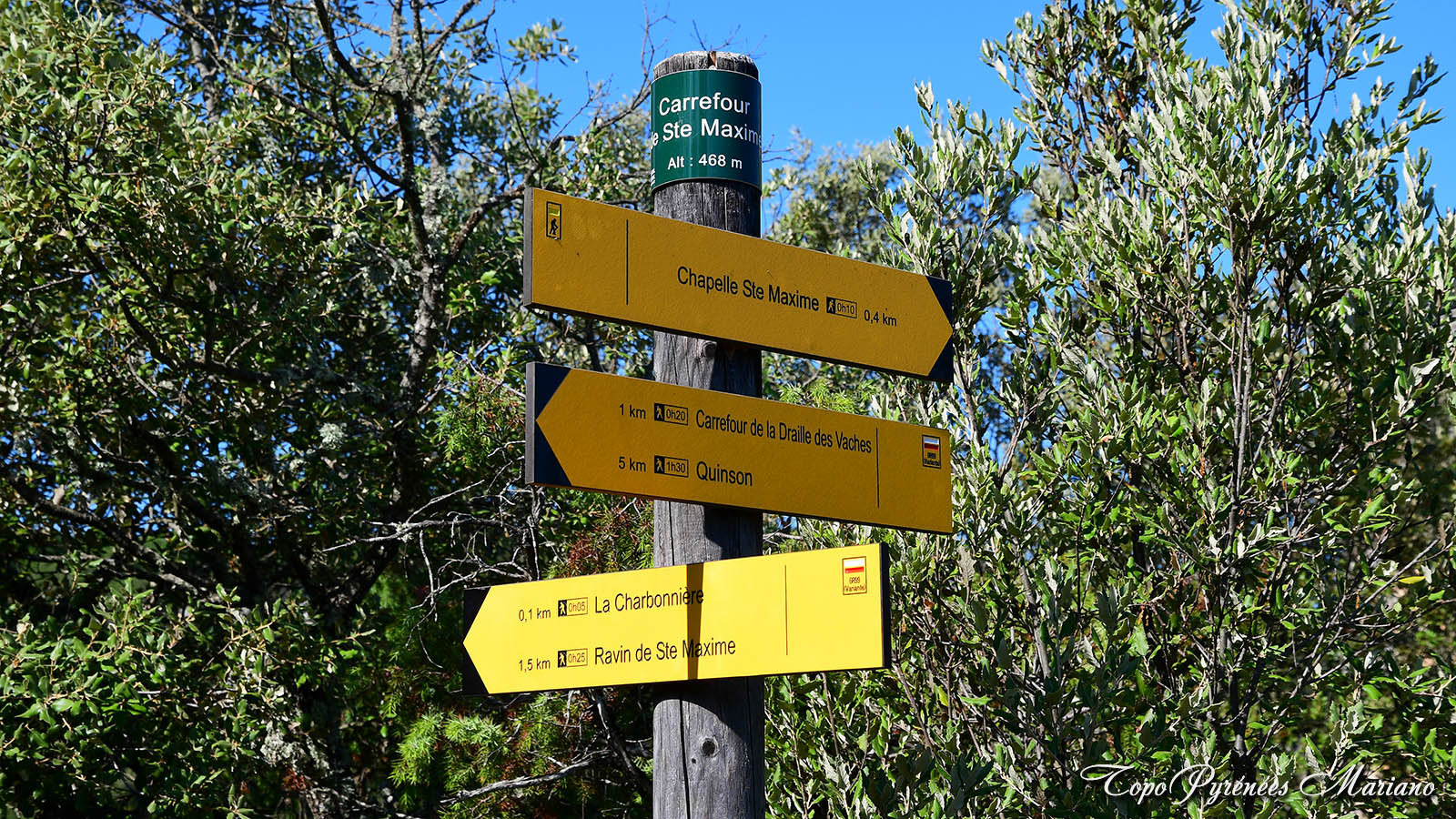 Le sentier ensuite arrive à une bifurcation altitude 395m. Les marcheurs continueront tout droit en suivant le balisage rouge et blanc jusqu’au carrefour Ste Maxime (468m), puis remonteront à gauche jusqu’à la chapelle Ste Maxime (sentier bien marqué).