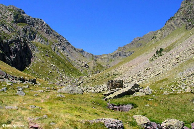 Vue derrière nous, la punta de la Garganda (2145m) et la station de Formigal. À 2120m, le sentier laisse en contrebas à gauche un replat jonché de gros blocs, où arrive du Sud un ruisseau adjacent. Le sentier monte à droite (Nord) pour entamer un Z afin de prendre de l’altitude et s’écarter d’un barranco où le ruisseau en cascade.