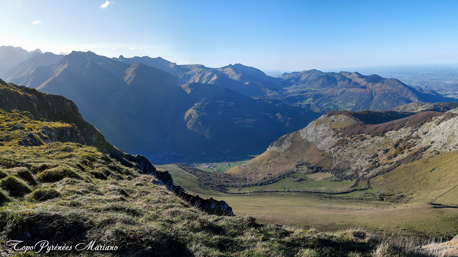 Panorama derrière nous vers les sommets des vallées d’Ossau et d’Aspe, jusqu’au Pays basque.