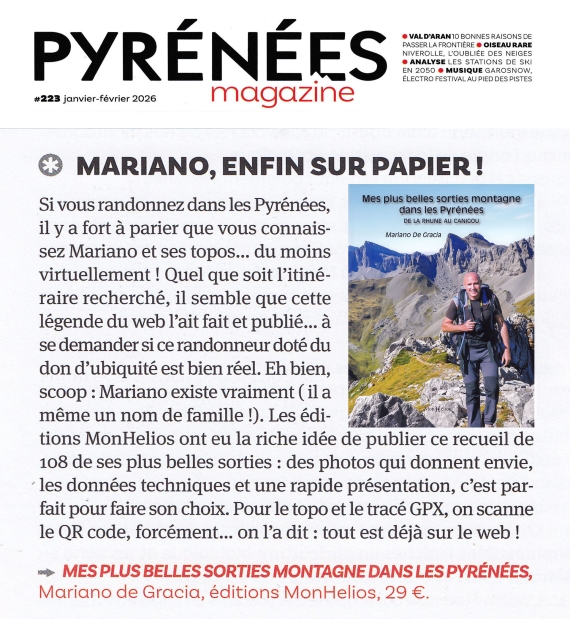 Lecteur de Topopyrénées depuis des années, et utilisateur des tracés, topos & conseils, j’ai demandé le livre de Mariano à Noël. Trop content, c’est un superbe travail de choix de photos, et les impressions sont de très bonne qualité. Bravo Mariano à vous et à votre éditrice pour ce super bouquin qui fait voyager à nouveau !