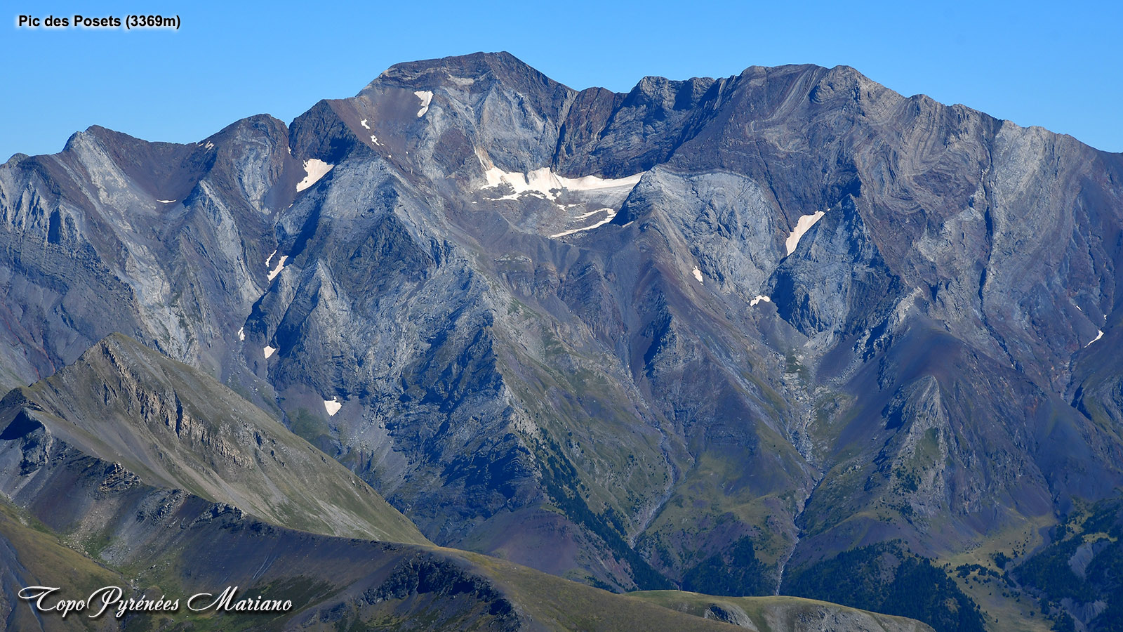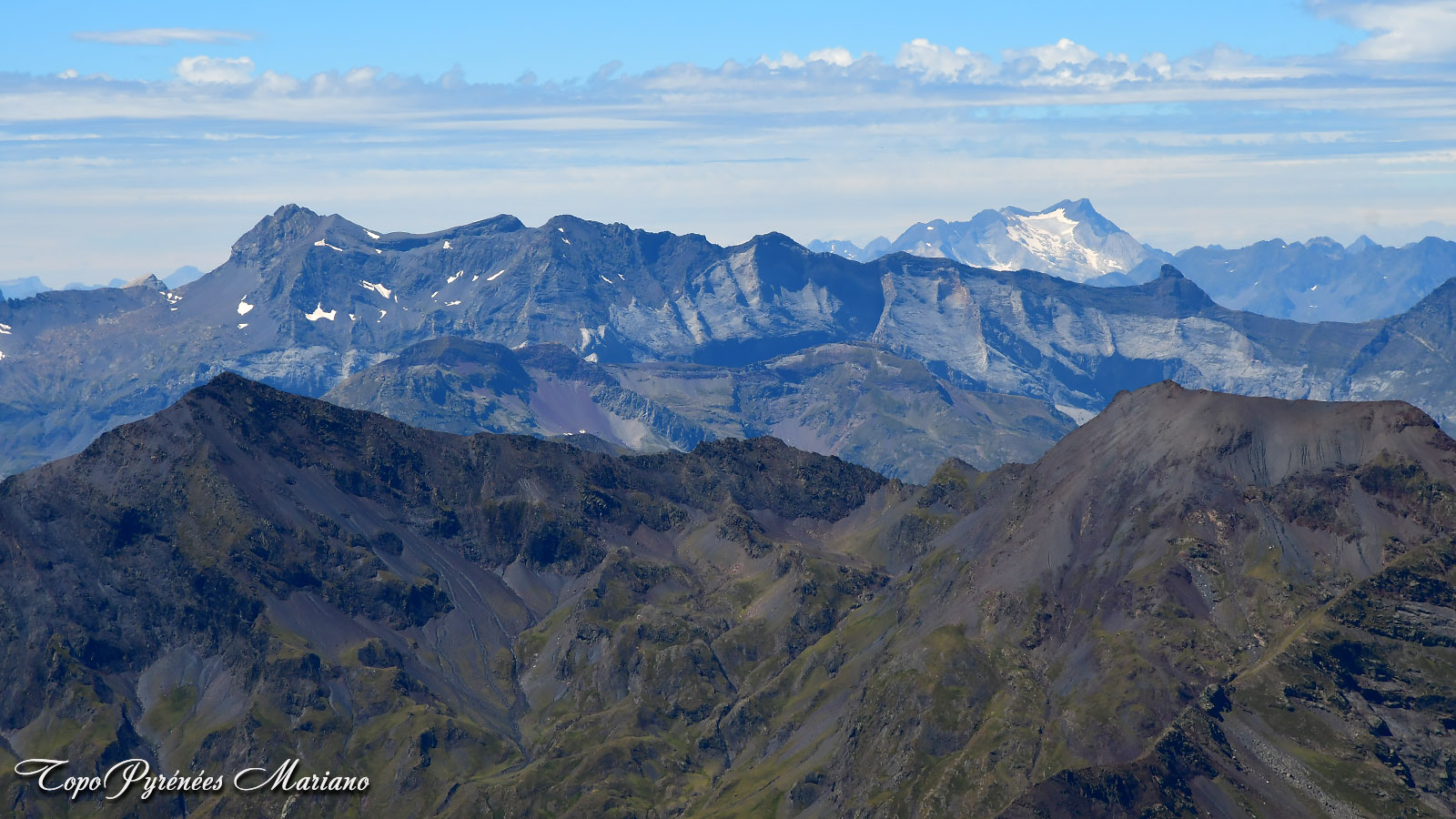 2em plus haut sommet de toute la chaîne des Pyrénées après l’Aneto (3404m) que l’on voit depuis Icilégèrement à gauche.