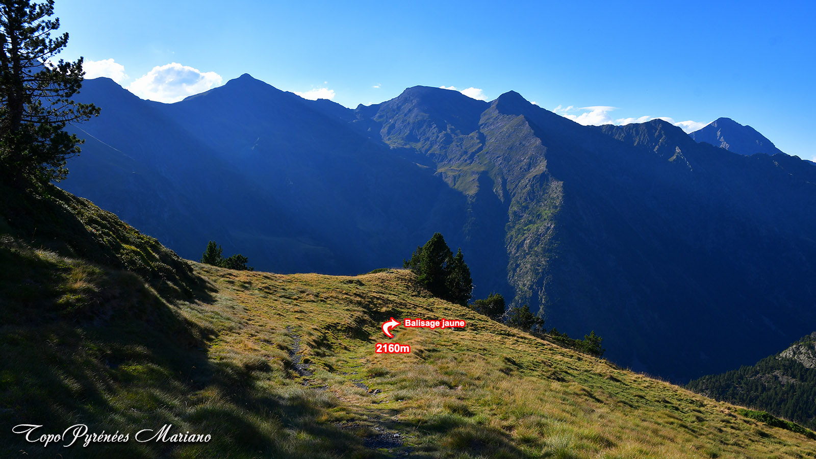Vers 2160m d’altitude, balisage jaune au sol, suivre le sentier qui vire à droite (Nord-Est).