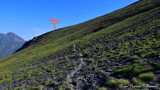 Au bout du lac, remonter ce couloir en suivant les cairns jusqu’à l’altitude 2400m.