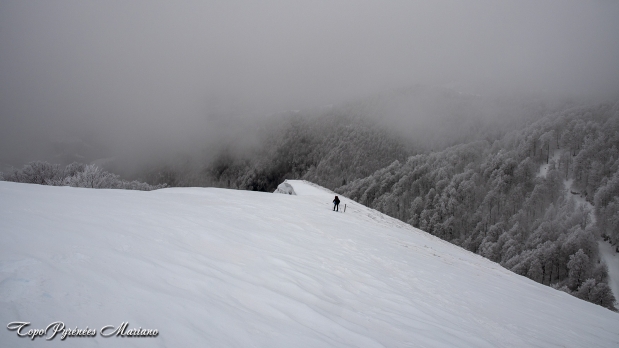 Malgré toutes ces vérifications qui étaient bonnes la veille, il arrive très souvent en hiver de ne pas pouvoir atteindre l’objectif du jour. La météo prévoyait du beau temps, or non seulement le soleil n’a jamais pointé le bout de son nez, mais c’est surtout le brouillard avec une visibilité de 5m qui nous a fait faire demi-tour au sommet du Pic des Escaliers, laissant le sommet d’Arthanolatze qui était prévu de faire.