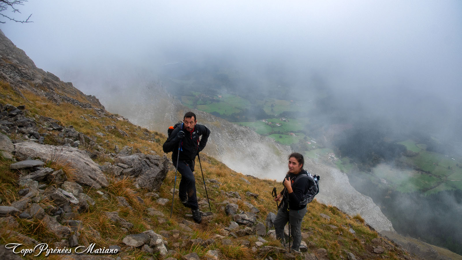 Nous étions partis pour faire la boucle complète de la crête Alluitz Anboto, course réservée aux montagnards confirmés avec une belle crête effilée très aérienne qui ne dépasse pas le niveau II+, mais une course engagée où l’erreur est interdite. Malheureusement les conditions du moment n’étaient pas bonnes, le massif d’Anboto était complètement bâché, humide et très glissant, beaucoup trop dangereux pour parcourir les 3h00 de crête avec un risque certain de glissade. Comme je le dis à chaque fois que des situations comme celle-ci se présentent : Savoir renoncer en montagne c’est le plus difficile, ce n’est ni honteux, ni dévalorisant, c’est simplement faire preuve de bon sens, c’est ce que nous avons fait !