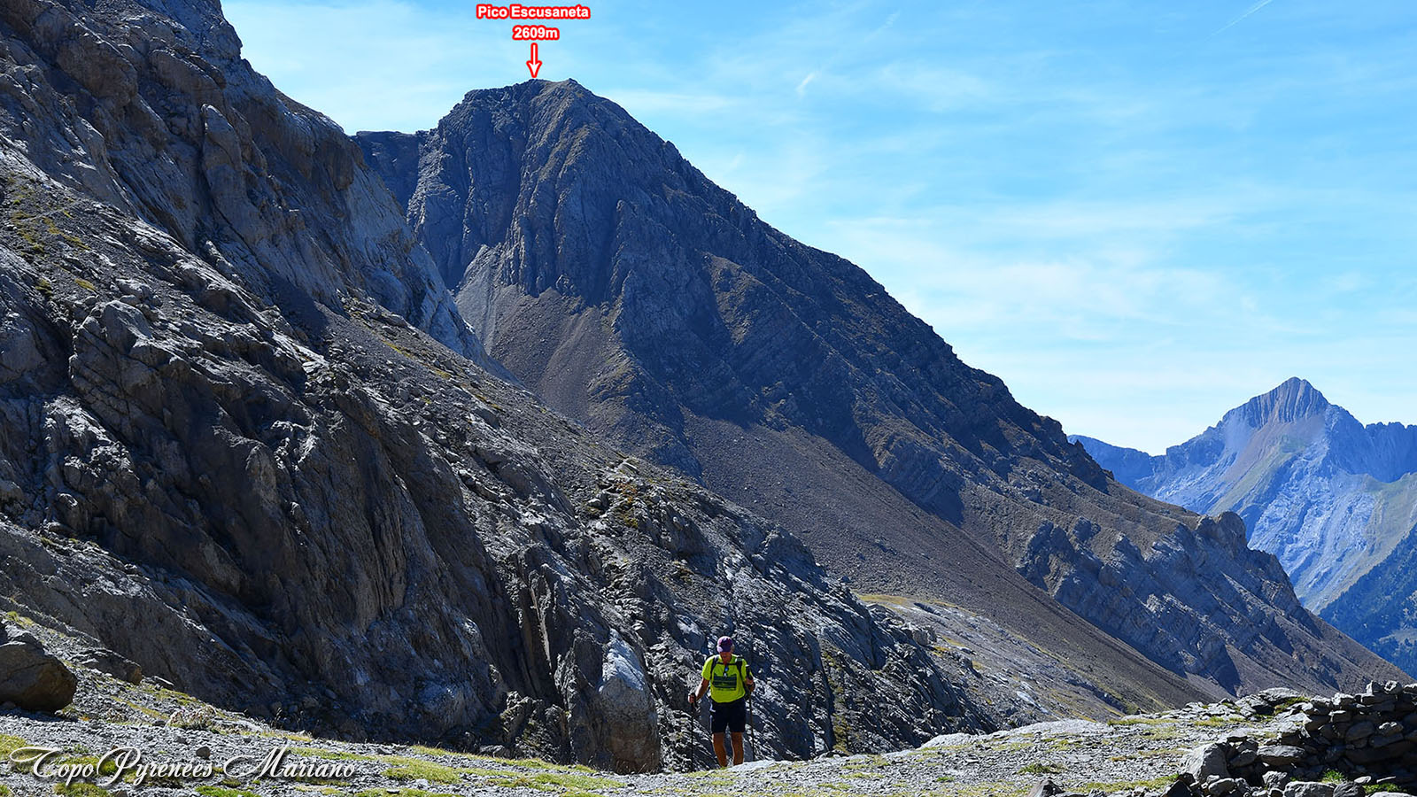 Si nous sommes montés en haut de ce petit sommet inconnu pour nous trois, c’est en partie à cause de notre échec au Gabiétous Occidentalpar le couloir de la Brèche SW des Gabiétous, il fallait trouver un plan B: la Punta Escuzana (2847m) appelé el Pico Mondarruego par les espagnols, était un peu trop loin pour l’heure déjà bien avancée (12h00). Pour ne pas rater complètement notre journée de montagne, nous nous sommes rabattus sur le sommet le plus proche de nous qui était sur notre itinéraire de retour: el Pico de l’Escusaneta (2609m), et honnêtement, nous n’avons pas regretté notre choix !