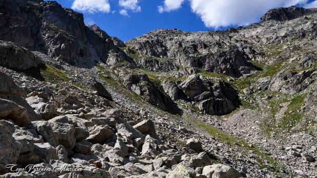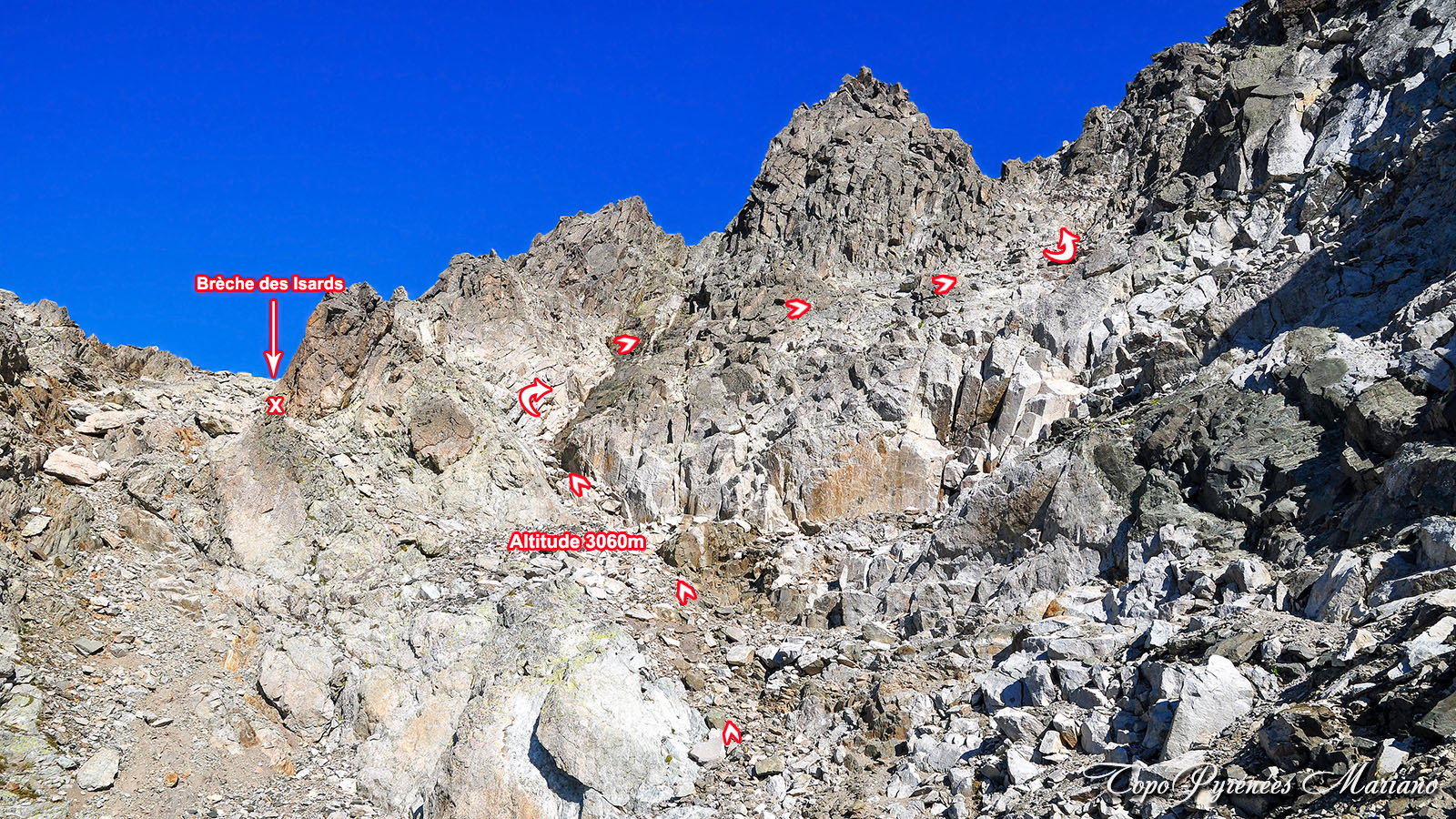 Le sentier depuis le départ est évident et bien cairné mais là, les choses se compliquent. Entre 3050m et 3060m, soit quelques mètres en dessous de la brèche des Isards (3066m) qu’il ne faut pas atteindre, s’élever à droite en utilisant les sentes cairnées dans les éboulis.