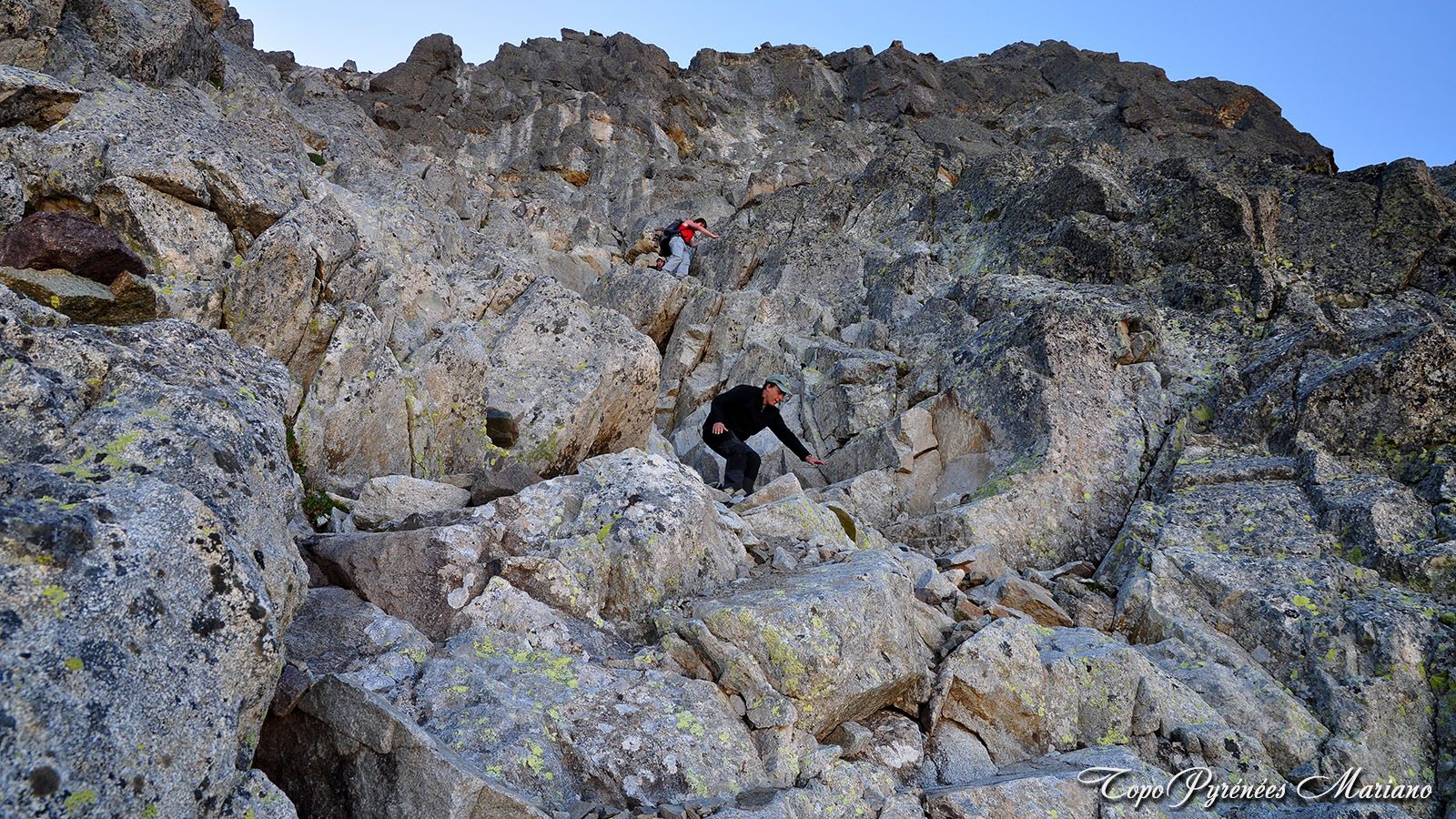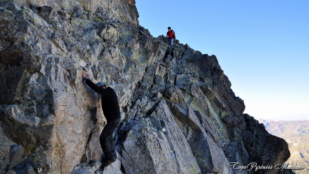 Le danger, comme souvent en pareil cas, provient des risques de chutes de pierres. Portez un casque et restez groupés en restant attentifs. Il est 17h42, je croise des randonneurs de La Rochelle qui me signalent que 2 Espagnols bivouaquent au sommet. Quelque part, j’étais un peu rassuré de savoir que je n’allais pas être seul à passer la nuit là-haut.