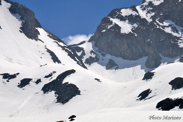 Le Soum de Siarrousse (2018m) est bien dégagé  et l’on voit bien que si nous étions montés en haut de ce sommet, la partie enneigée aurait posé problème !