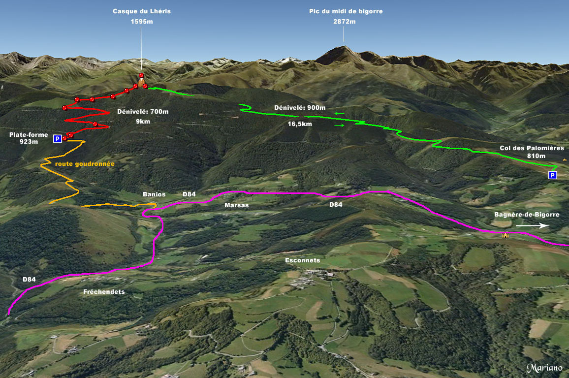 Le Casque du Lhéris (1595m) doit son nom à sa ressemblance avec un casque. Il est incontournable dans la région de Bagnères-de-Bigorre, l’itinéraire classique démarre depuis le col des Palombières (810m), mais l’accès le plus rapide au sommet se fait depuis la plate-forme altitude 923m, au-dessus du village de Banios. Très belle vue au sommet sur le pic du Midi de Bigorre et sur l’Arbizon avec un vaste panorama vers la plaine.