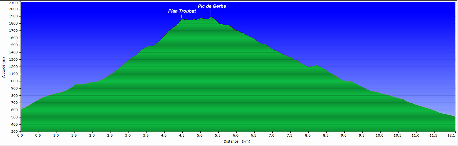 La grimpette se fait par les crêtes de Biosque jusqu’au sommet du Plaa Troubat (Ouest) soit presque 900m de dénivelé avec des pentes entre 30 et 40°.
