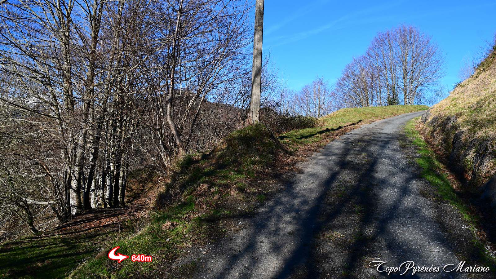 A l’arrivée de la bifurcation (1064m) prendre à droite et suivre la piste goudronnée qui descend vers le Sud-S.O.