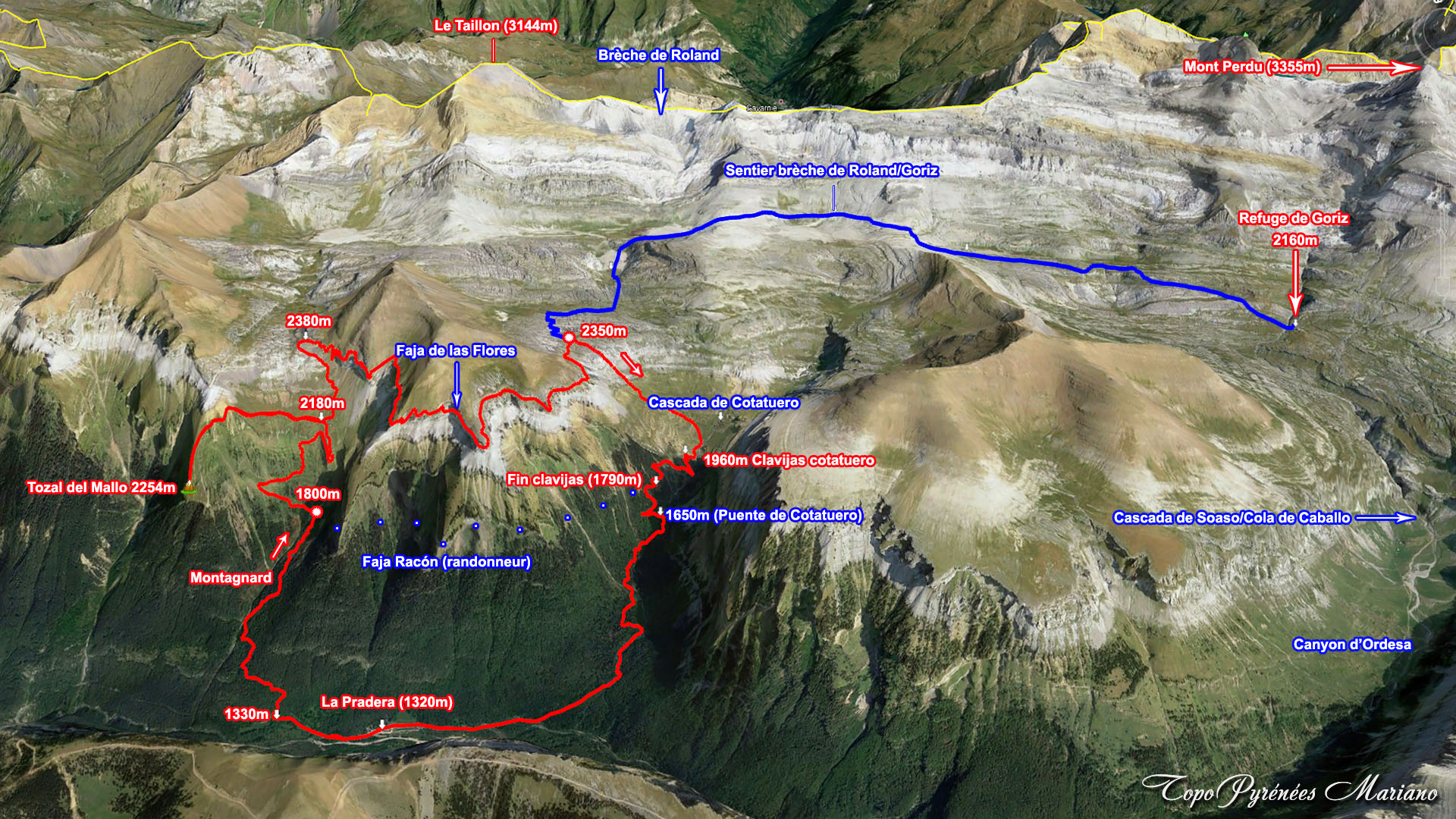Pour ceux qui ne font que le Tozal de Mallo et la Faja de las Flores, vers 2350m, suivre le sentier de droite qui plonge dans le cirque de Cotatuero, le chemin s’y enfonce pour descendre aux Clavijas de Cotatuero (32 barres de fer plantées dans la roche); une rangée pour les pieds, une pour les mains, un câble est là pour servir de main courante.