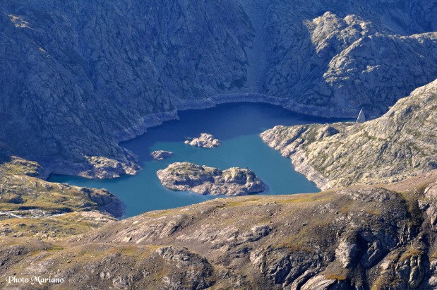 Vue plongeante sur le lac de la Fache 2340m où nous avons notre tente et le refuge du Wallon 1865m.