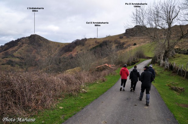 Pour les randonneurs qui ne veulent pas contourner le pic d’Arrolakoharria sans passer par le col, quitter la piste pour s’élever vers l’Est et atteindre la crête vers 1040m (Attention: les portions herbeuses sont abruptes) itinéraire en rouge sur la photo.
