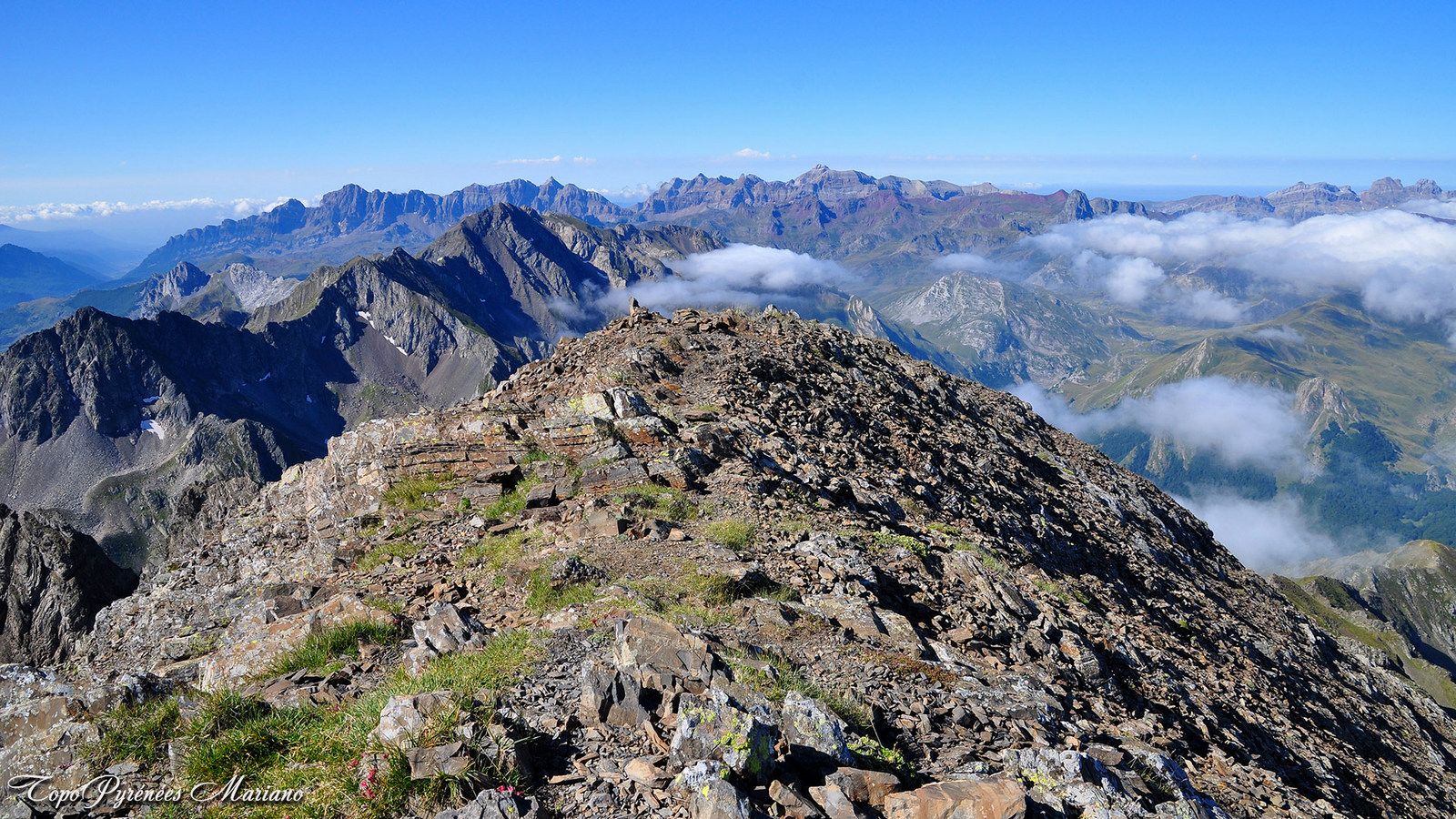 Je profite de prendre des photos avant que la mer de nuages ne s’élève et m’empêche de voir les sommets secondaires comme ici le pic d’Anie (2504m).