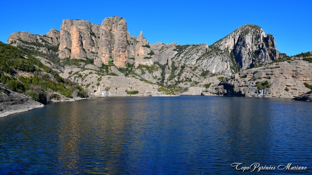 Une des plus belles cartes postales de nos Pyrénées, les Mallos de Ligüerri depuis le barrage de Vadiello.