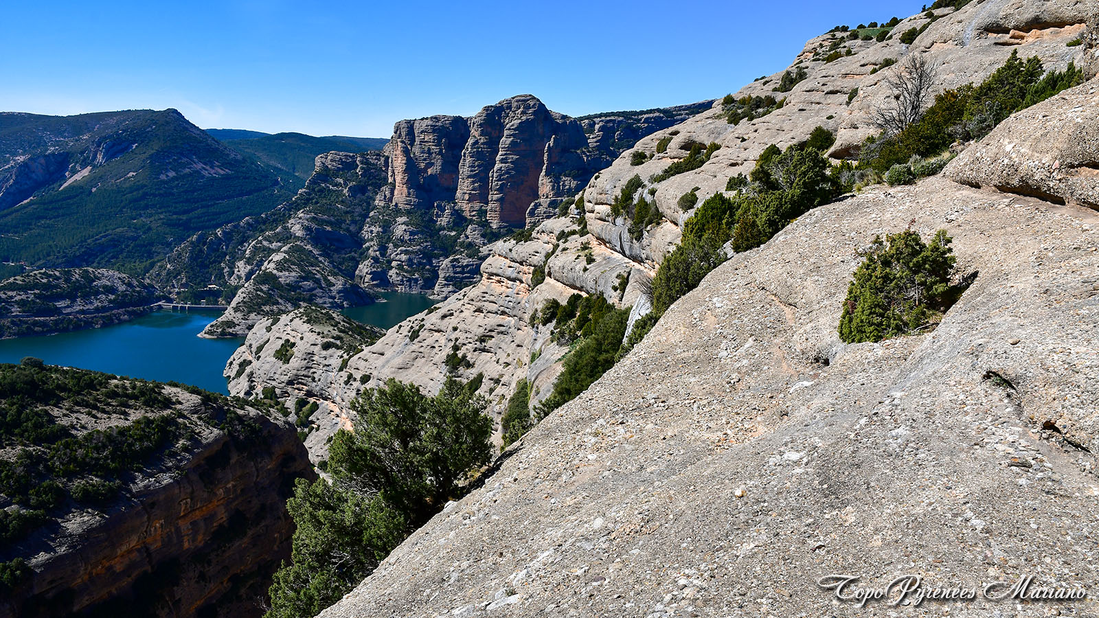 Vue splendide sur les Mallos de Lazas, Ligüerri et Pico Borón (1327m) depuis le barrage de Vadiellio.