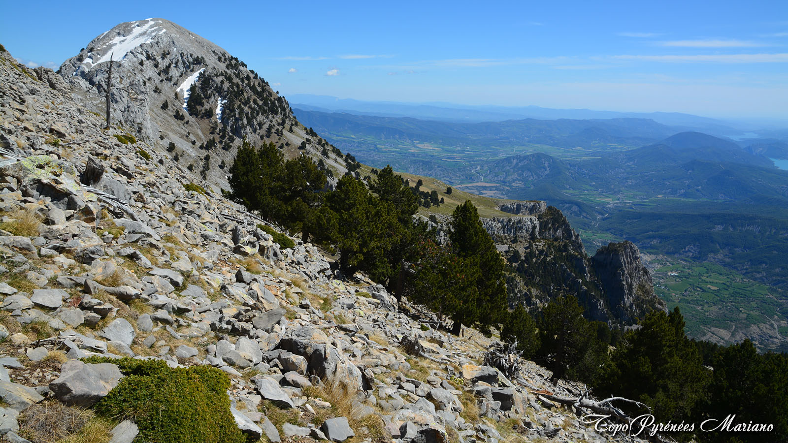 Après une descente dans le pierrier sur le fil de crête en douceur, le sentier est maintenant évident.