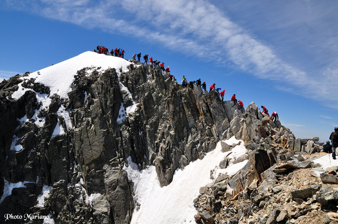 Cette courte arête déchiquetée s’est construite sur une renommée qui dépasse sûrement le degré de difficulté qu’elle propose en réalité. En tout cas s’il vous faut attendre votre tour pour monter ou descendre, il faut bien admettre qu’il y a de quoi patienter avec le magnifique panorama que nous offre ce sommet.