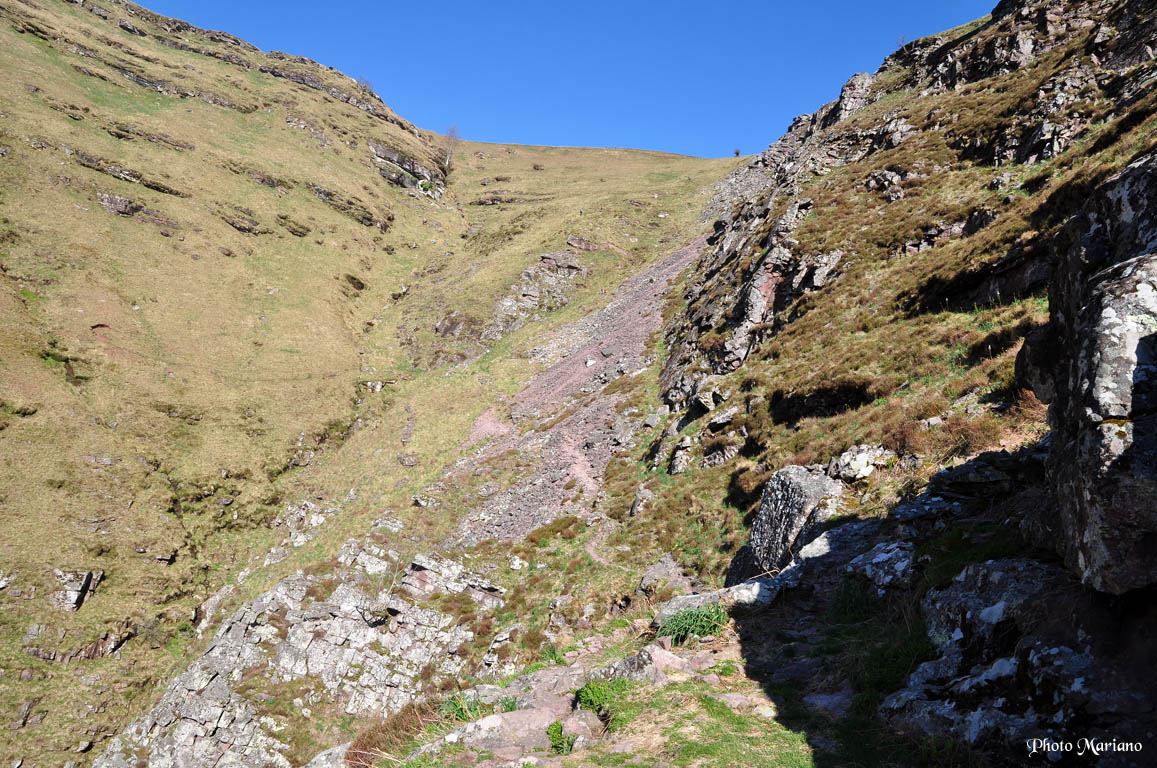 On sort du ravin par la droite en effectuant quelques zigzags.