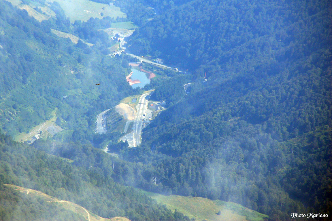 Entrée tunnel du Somport côté Français, lac du Peilhou (1031m) et les Forges d’Abel à gauche.