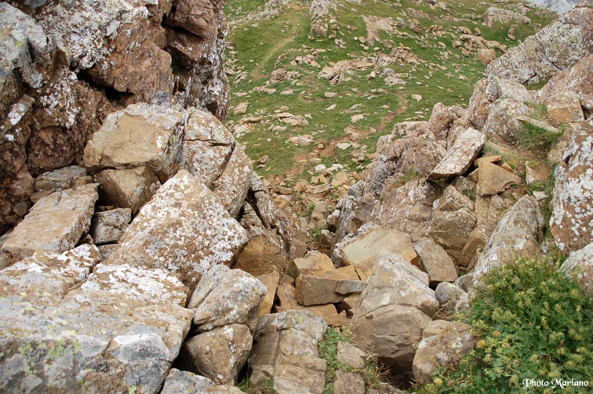 Après le collet, descendre dans la pierraille pour retrouver une sente bien cairnée.