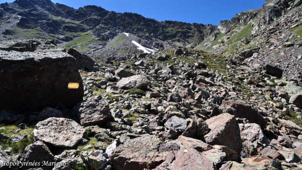 Philippe Bringay, le gardien du refuge a balisé avec de la peinture jaune tous les itinéraires du secteur. Même si les itinéraires se font le plus souvent hors sentier et sans trop de cairns, avec le balisage en jaune de Philippe (tous les 10 à 20m) vous ne vous perdrez pas !