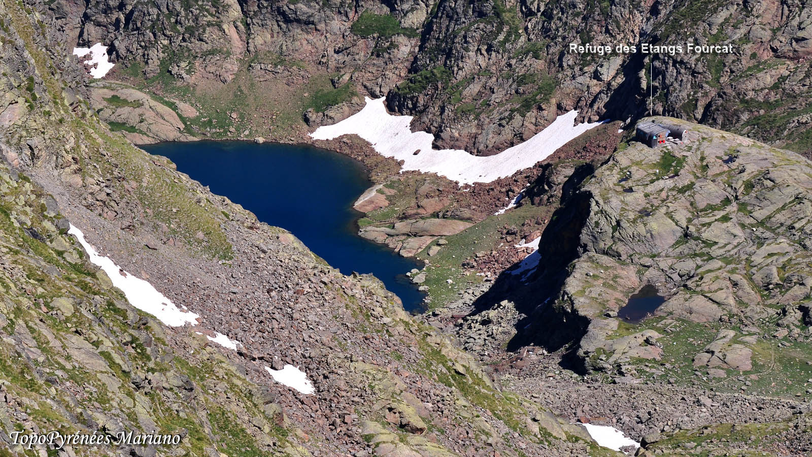 Vue plongeante sur le refuge des étangs Fourcat et le petit étang, 420m plus bas.