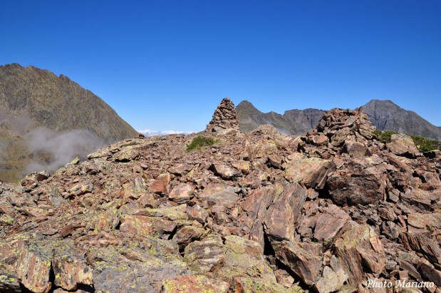 Dès les deux premiers lacets dans la pierraille, des cairns vous incitent à aller tout droit, il est préférable et plus sécurisant de continuer sur la sente qui continue à gauche, plutôt que d’aller tout droit et d’enjamber les gros blocs dans le pierrier.