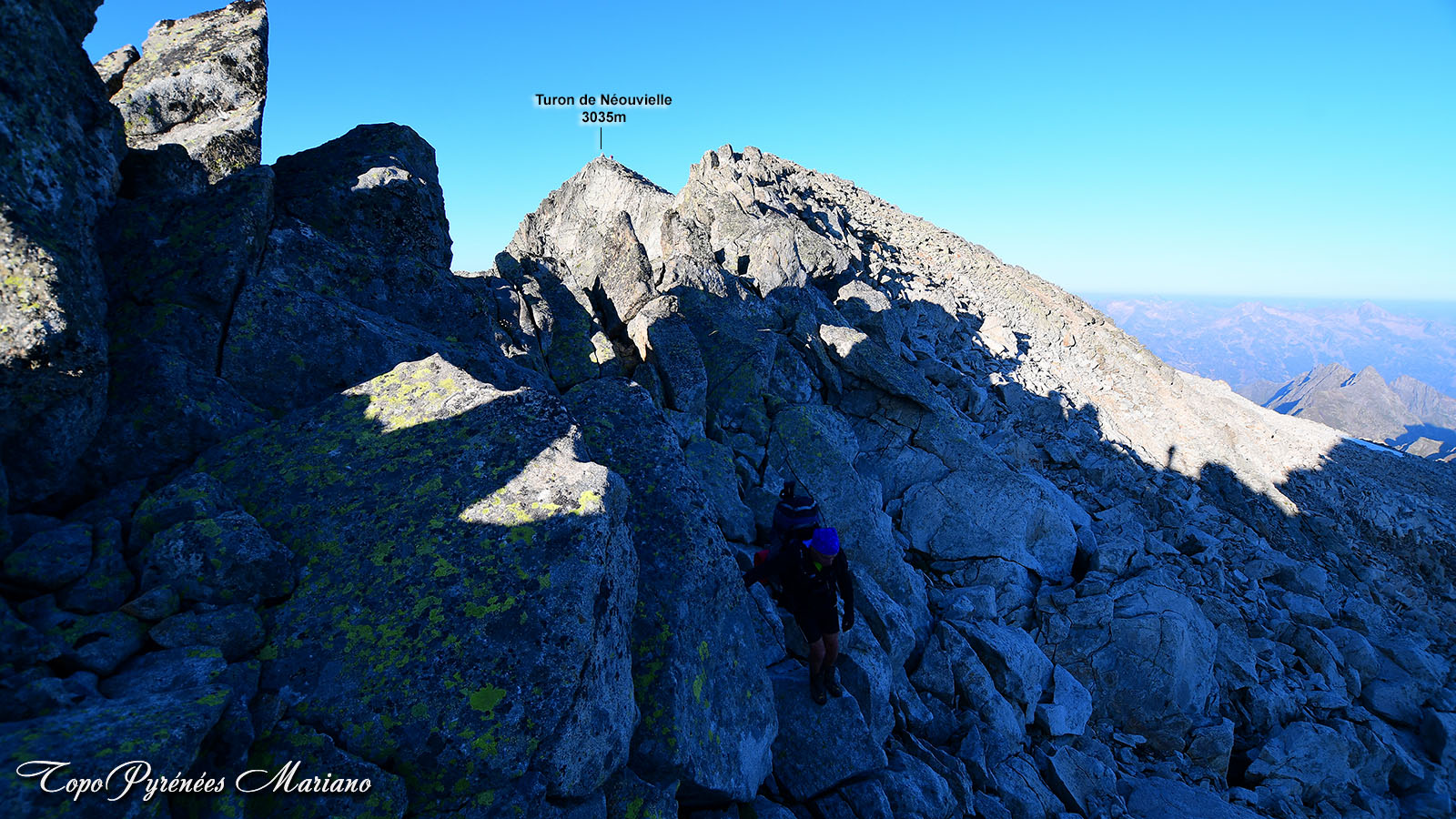 Depuis la brèche du Néouvielle (2920m), suivre le fil de l’arête, composé de gros blocs. Au bout d’une centaine de mètres, on arrive sur une section horizontale. Un peu plus haut, on bute sur un court dièdre (IV, 2 pitons, 1 coinceur coincé), qui peut s’éviter en traversant versant E par une boîte au lettre (III aérien), puis en regagnant rapidement l’arête ensuite.