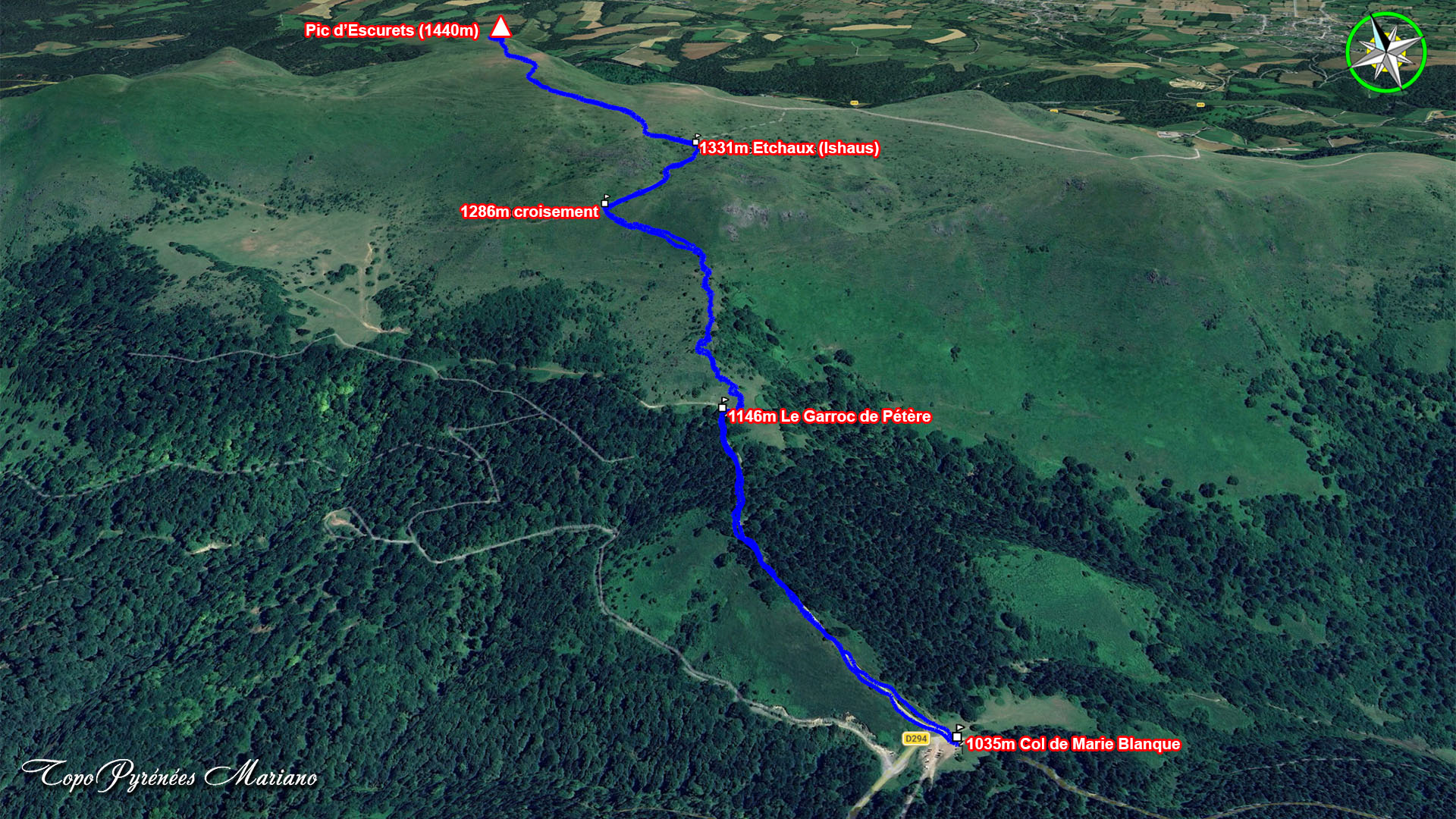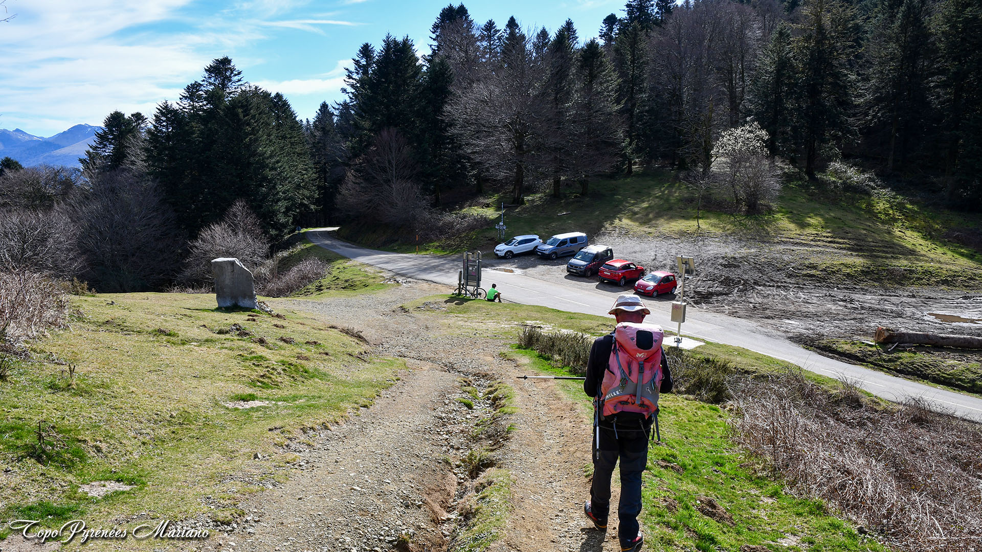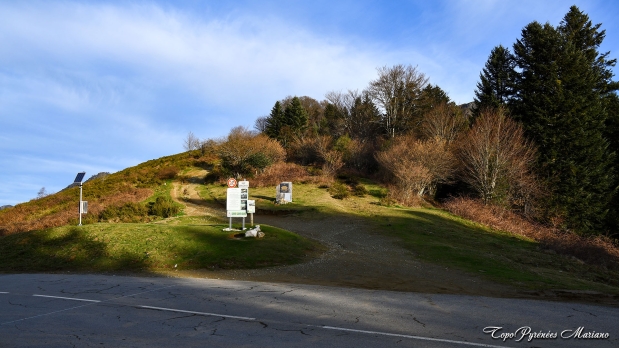 1035m, col de Marie Blanque, départ de la randonnée. Monter le chemin sur la crête au Nord-Ouest, chemin à gauche de la photo.