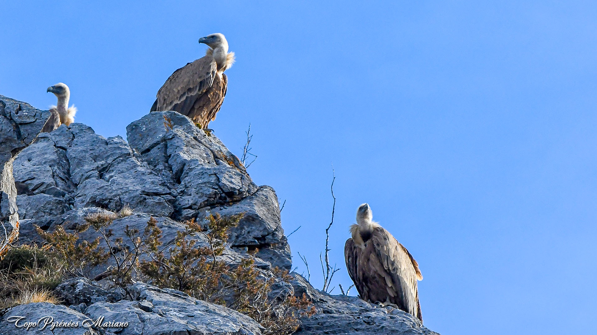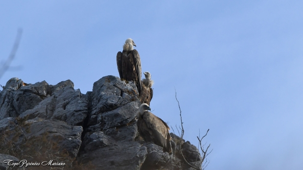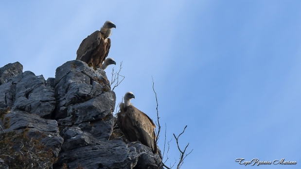 Trois vautours fauves observent attentivement les conditions idéales pour s’envoler.