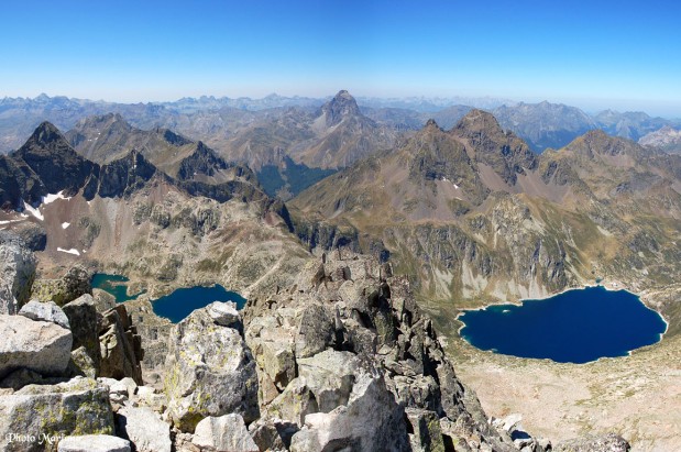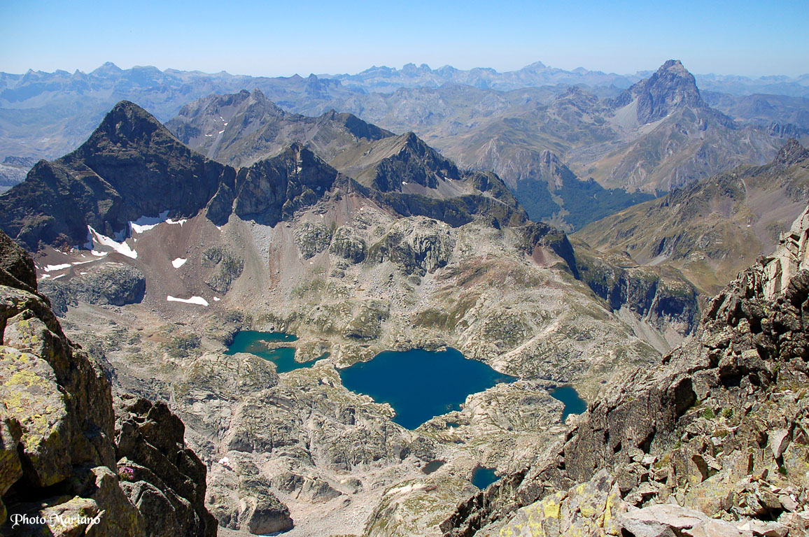 Les lac d’Arriel, lacs d’Arrémoulit et le pic d’Arriel (2824m) au milieu avec la chaîne pyrénéenne espagnole en arrière-plan.