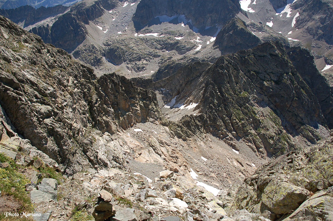 Après être resté 1h15 au sommet, la voie des Géodésiens étant trop technique pour moi, pas encore l’expérience d’un vrai montagnard, je décide de repartir sagement par le même itinéraire que le matin.