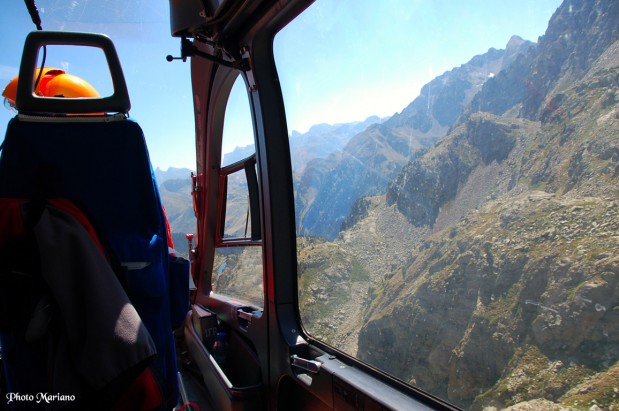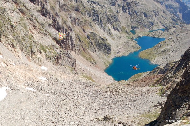 Un sapeur-pompier suspendu par le câble du treuil m’a rejoint, pour me préparer à l’hélitreuillage, ce n’était pas facile avec ce gros rocher au-dessus de nous, obligé de se balancer pour rejoindre la petite plate-forme. Suspendus vers 3.000m d’altitude entre le Palas et le Balaïtous, nous remontons hélitreuillés dans l’hélicoptère des sapeurs-pompiers de Pau.