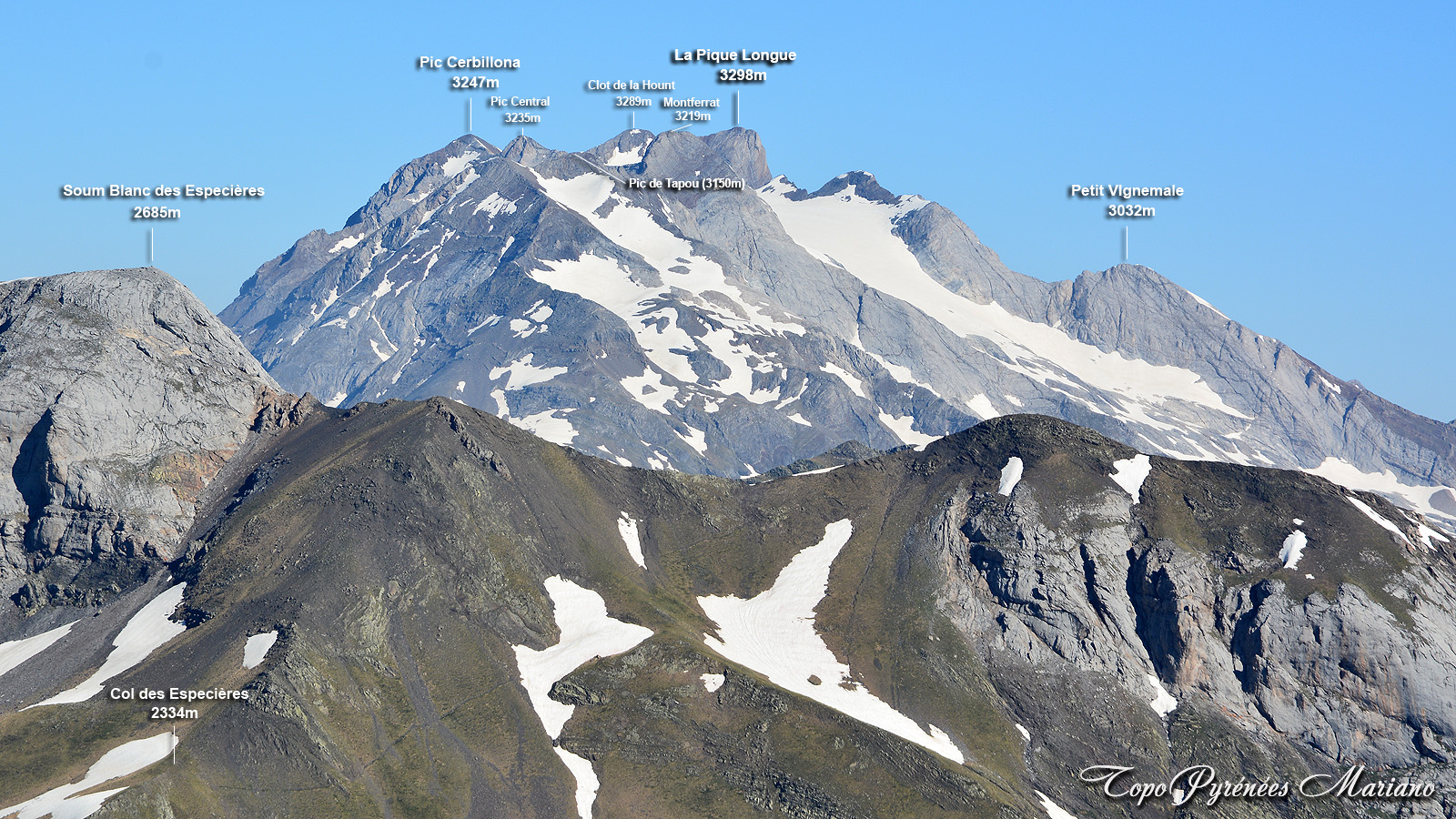 Le sommet de la Pique Longue (Vignemale 3298m) lui est le plus haut sommet frontalier Français.