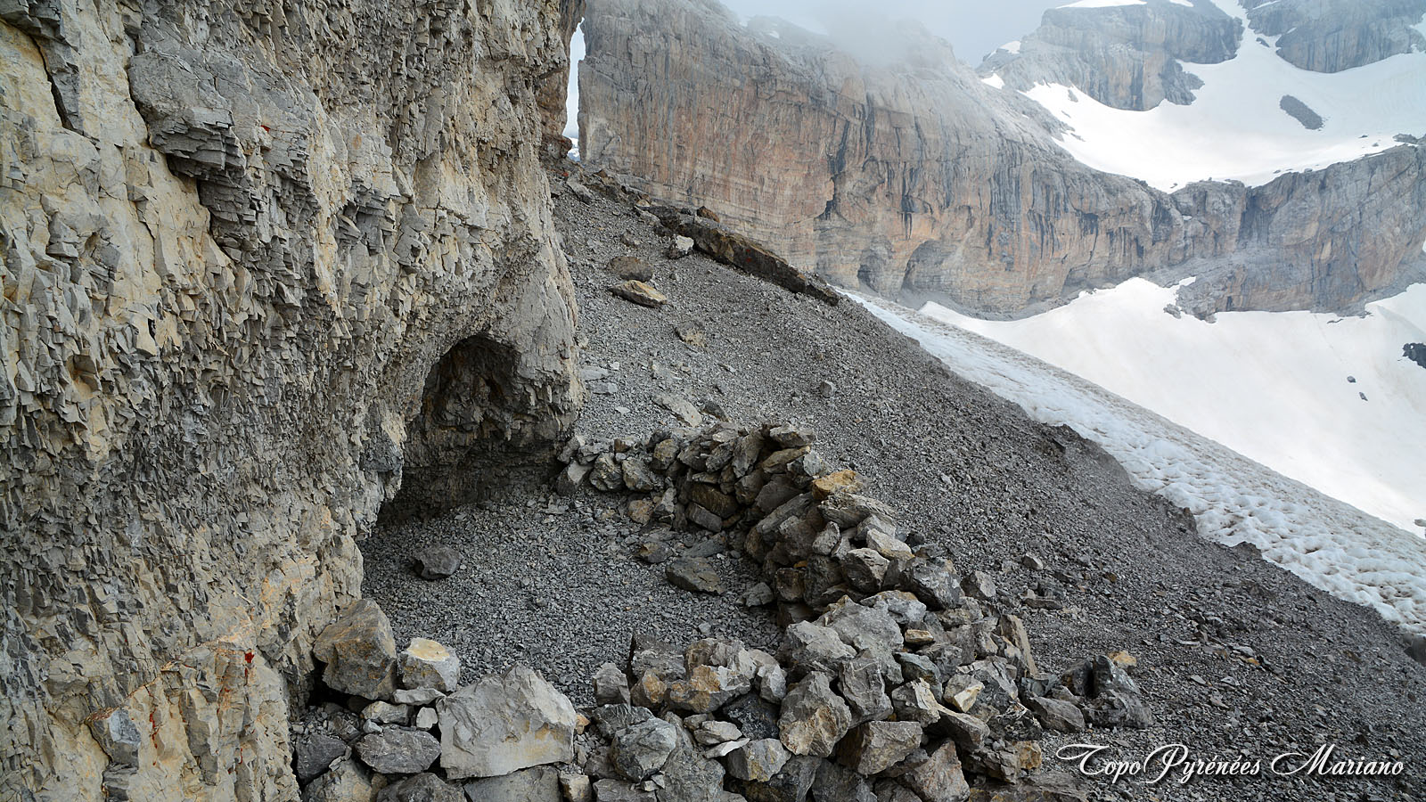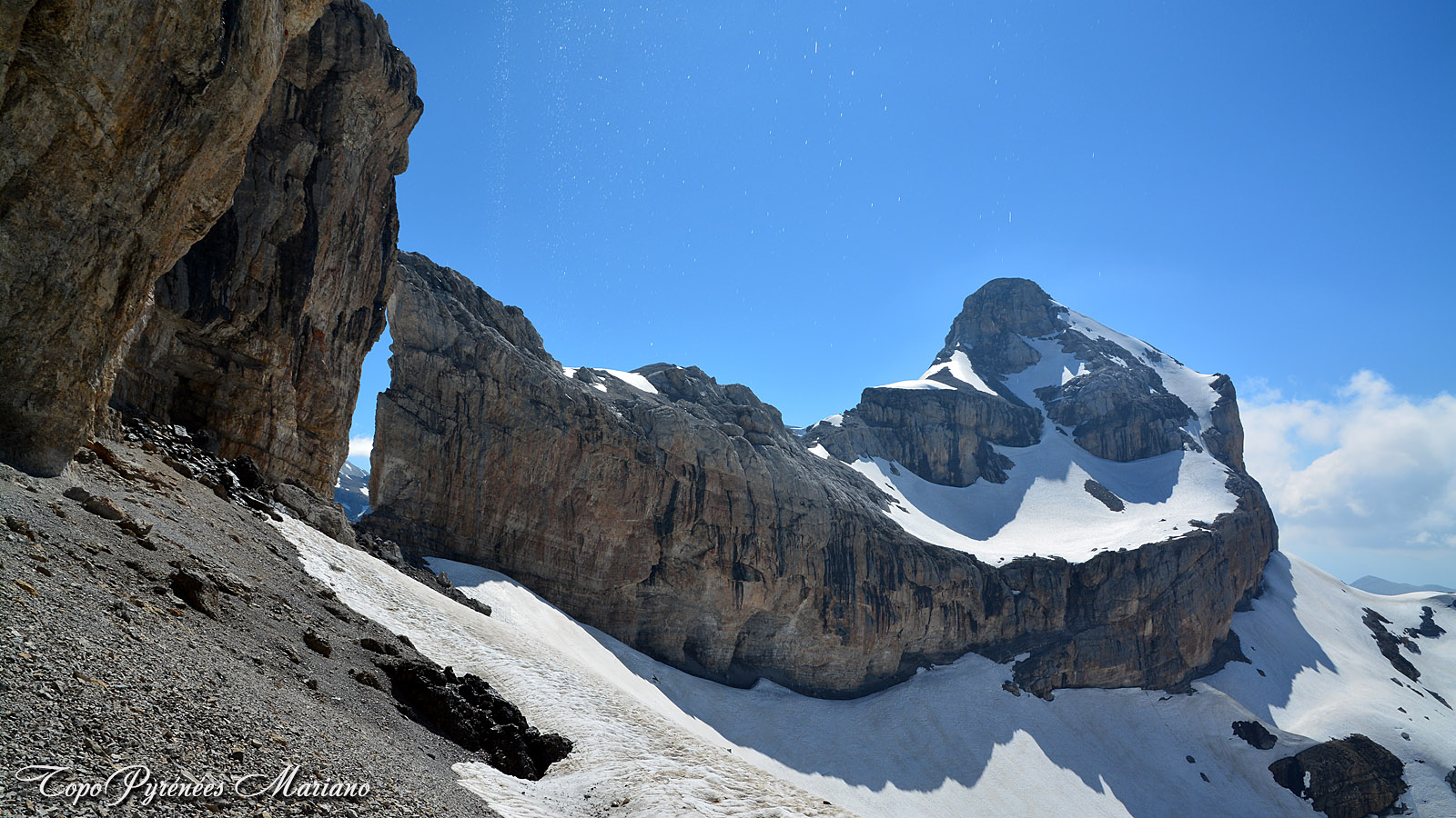 Le Casque du Marboré (3006m) avec le pas des Isards et la sortie de la grotte souterraine montant au casque.