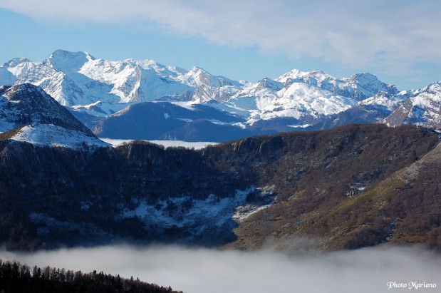 Mer de nuages au-dessus de la vallée d’Ossau et le village de Laruns.