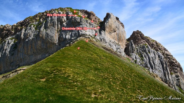 Depuis le col de Liard, remonter cette croupe herbeuse jusqu’au pied de la cheminée.