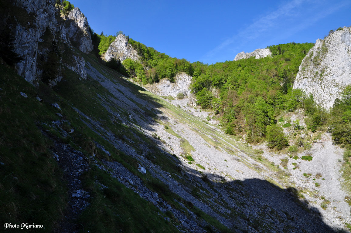 On voit bien le petit plateau herbeux, la pente n’est pas trop abrupte, la descente se fait sans difficulté.